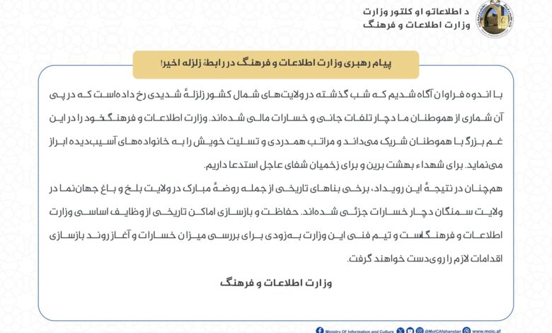 وزارت اطلاعات و فرهنگ اعلام کرد که زلزله دیشب در شمال کشور باعث خسارات جزئی به برخی آثار تاریخی از جمله روضه مبارک در بلخ و باغ جهاننما در سمنگان شده و تیمهای تخنیکی برای ارزیابی و بازسازی آماده میشوند.