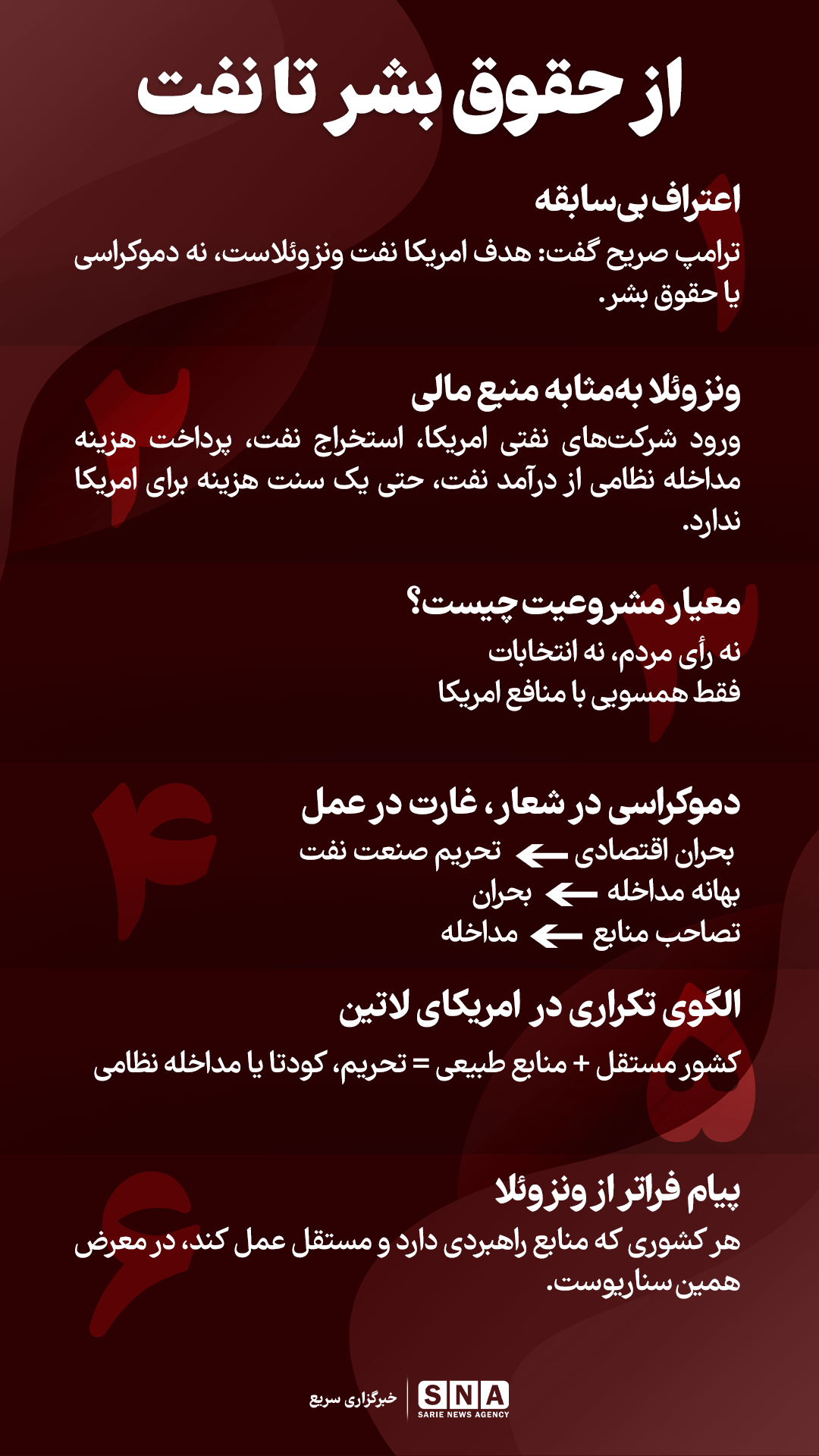 وقتی رئیسجمهور امریکا خودش اعتراف میکند، دیگر جایی برای توجیه باقی نمیماند. ترامپ نه از دموکراسی گفت، نه از حقوق بشر؛ او فقط از نفت ونزوئلا حرف زد. ونزوئلا هشداری است برای هر ملتی که منابع دارد و مستقل تصمیم میگیرد.