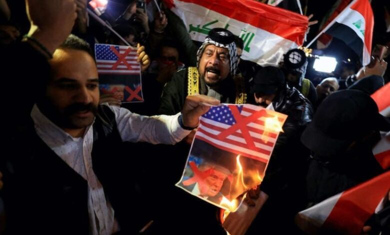 در واکنش به مداخلات دونالد ترامپ در امور داخلی عراق، شهروندان این کشور با برگزاری راهپیمایی اعتراضی، تصاویر رئیسجمهور امریکا و بیرق این کشور را آتش زدند و شعار «امریکا شیطان بزرگ است» سر دادند.