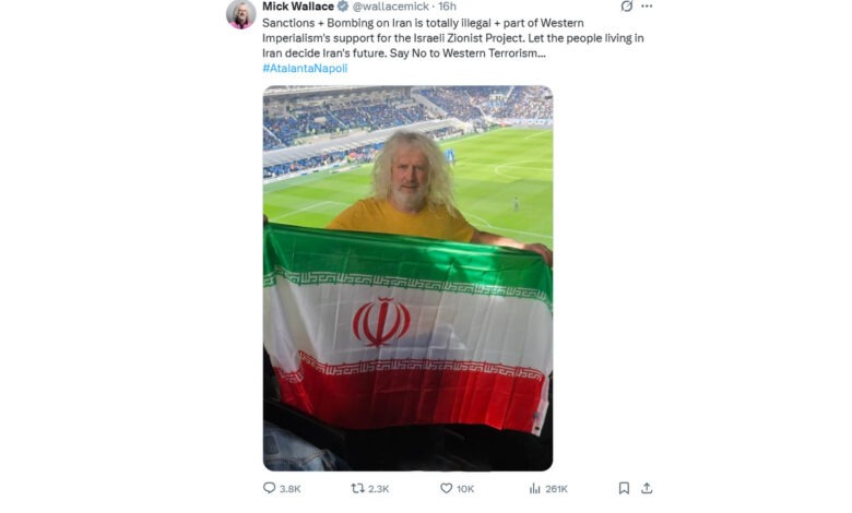 به گزارش خبرگزاری سریع؛ میک والاس، سیاستمدار ایرلندی و نماینده پیشین پارلمان اروپا، تصویری از خود منتشر کرد که در آن بیرق ایران را در جریان بازی دو تیم ناپولی و آتلانتا در دست دارد.