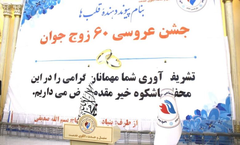 مراسم عروسی دستهجمعی ۶۰ زوج جوان با حضور مقامات، چهرههای اجتماعی و تجار در شهر هرات برگزار شد و برای هر زوج ۷۲ قلم وسایل خانگی اهدا شد.