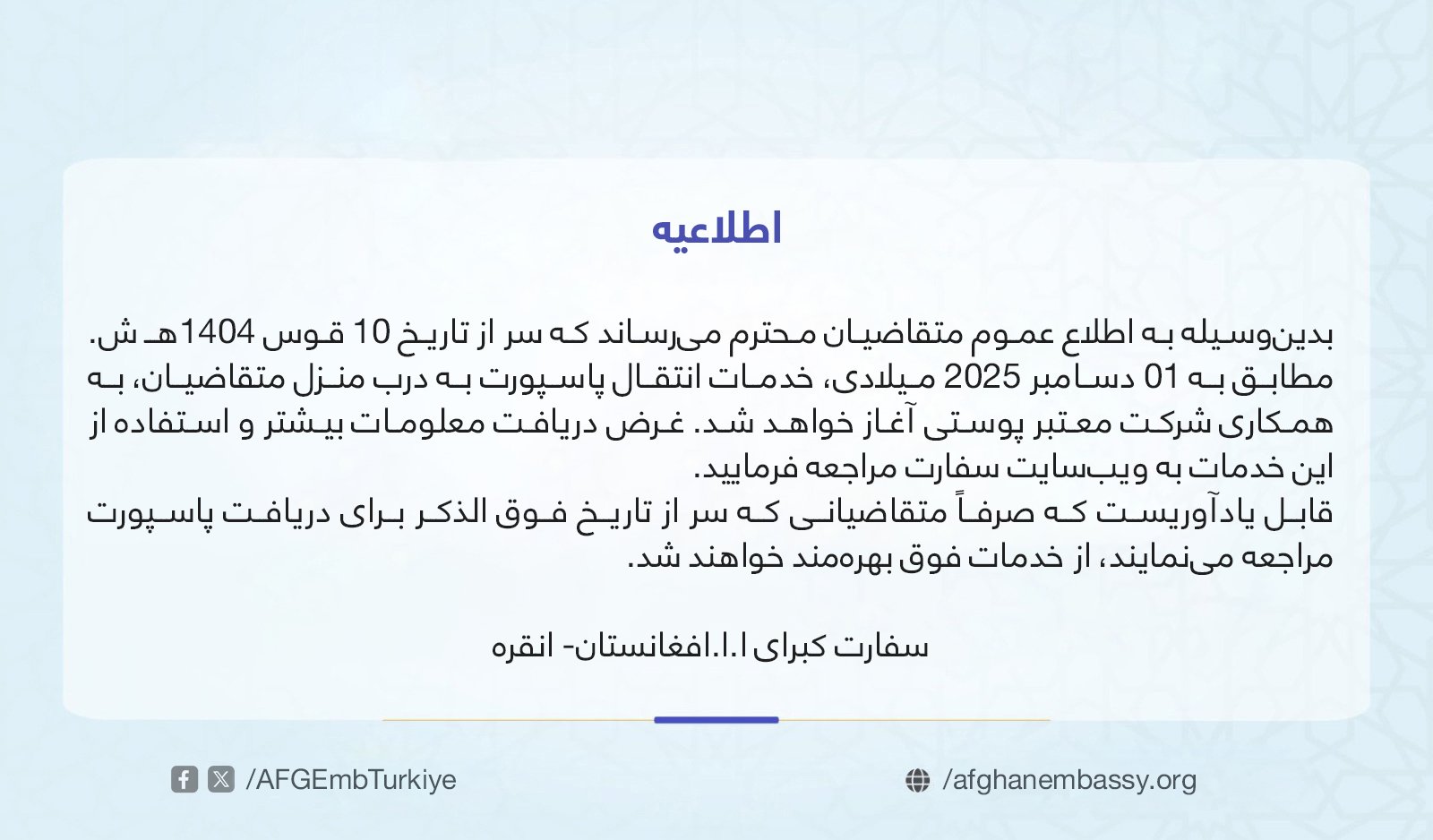 سفارت افغانستان در ترکیه از آغاز خدمات تازهای خبر داد که بهموجب آن پاسپورت متقاضیان از اول دسامبر ۲۰۲۵، با همکاری یک شرکت معتبر پستی، مستقیماً به درب منزل آنان ارسال میشود.