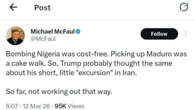 به گزارش خبرگزاری سریع مکفال روز پنجشنبه، 12 مارچ، در صفحه اکس نوشته است: بمباران نیاجریا هزينهای نداشت، دستگيری مادورو…